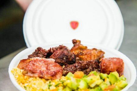 Acompanha arroz, feijão, angu, salada, macarrão.